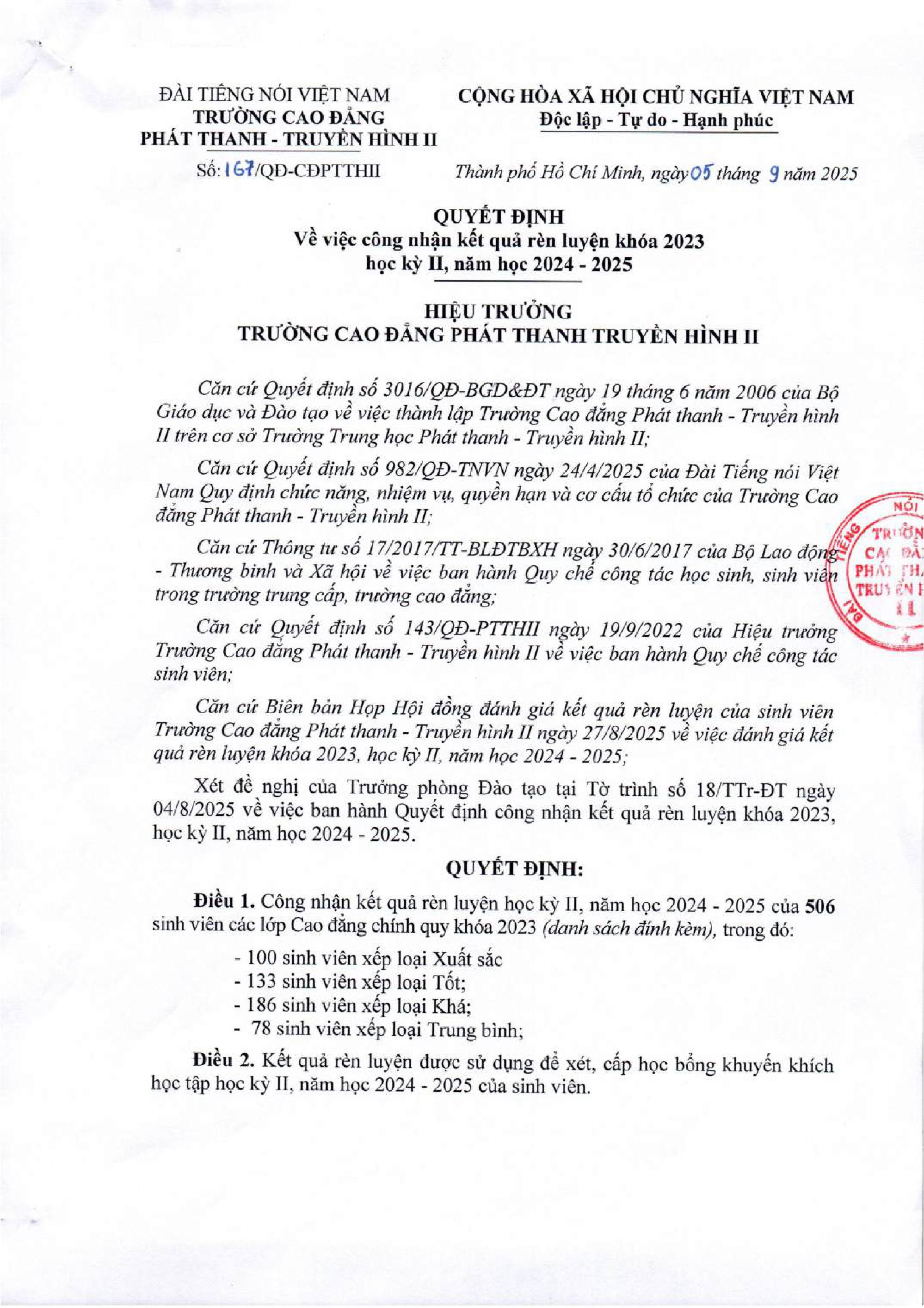 Quyết định về việc công nhận điểm rèn luyện khóa 23, học kỳ II năm học 2024-2025