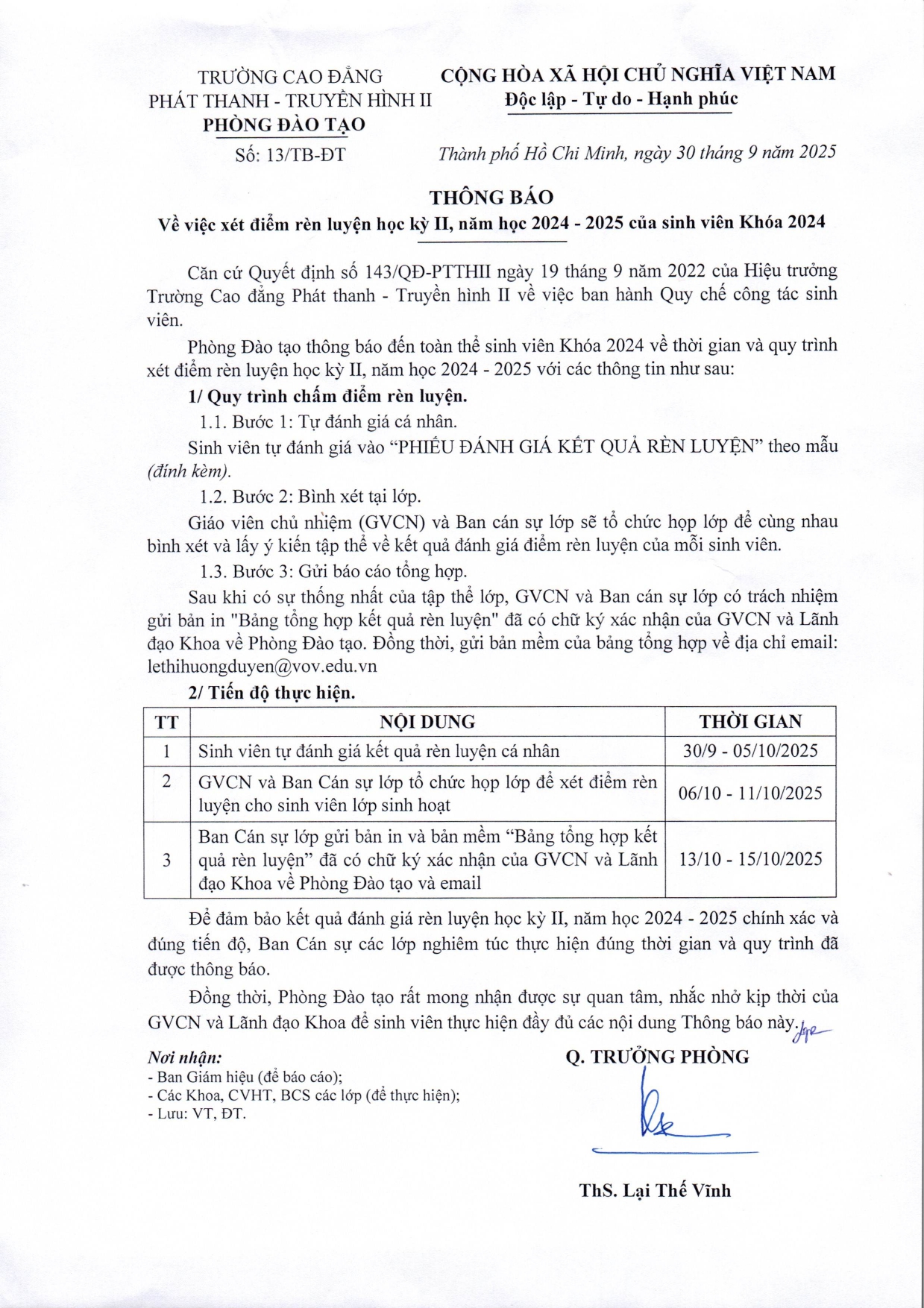 Thông báo về việc xét điểm rèn luyện học kỳ II, năm học 2024 - 2025 (đối với khóa 2024)