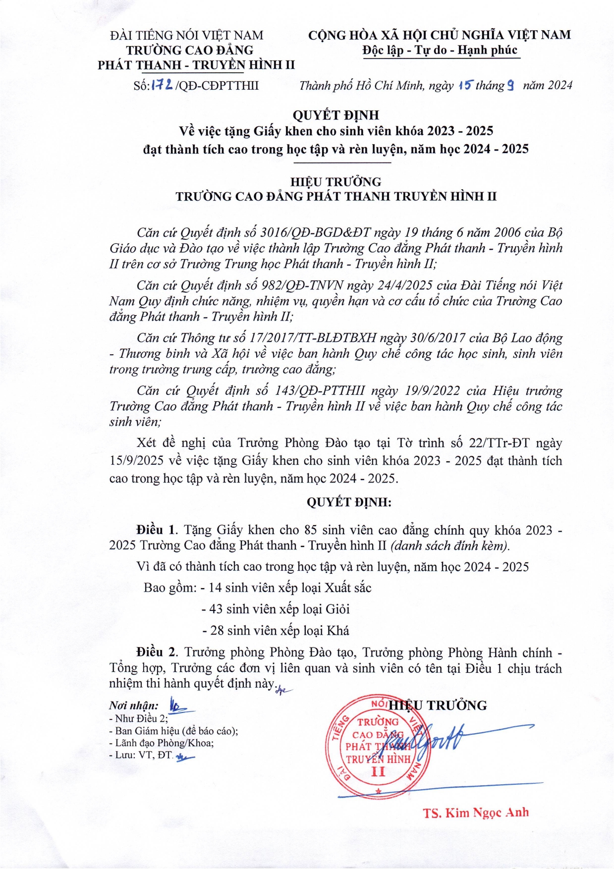 Quyết định về việc tặng Giấy khen cho sinh viên khóa 23 đạt thành tích cao trong học tập và rèn luyện, năm học 2024 - 2025