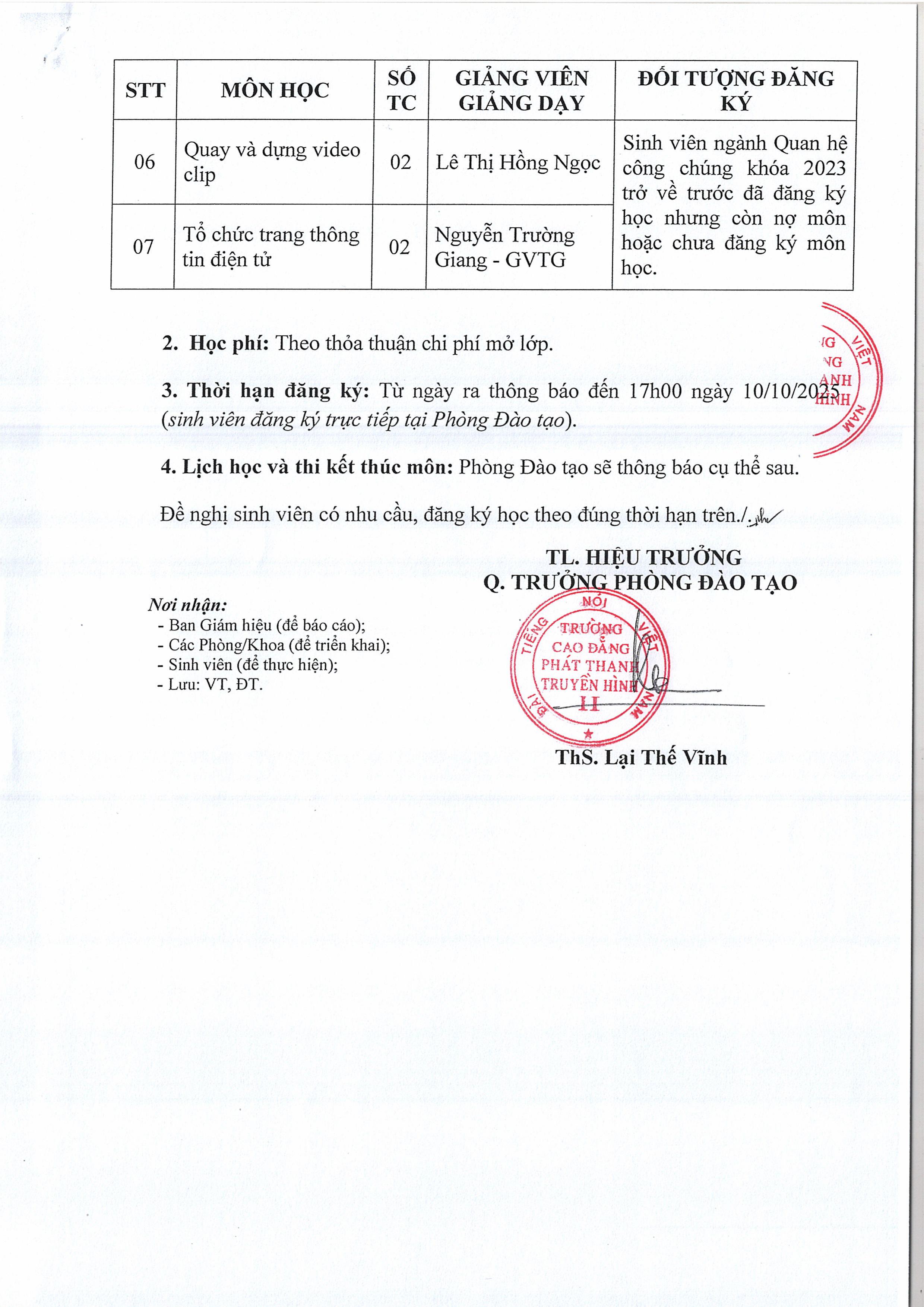 Thông báo về việc mở lớp bổ sung môn học học kỳ 1, năm học 2025-2026